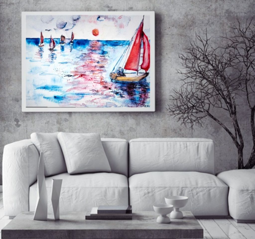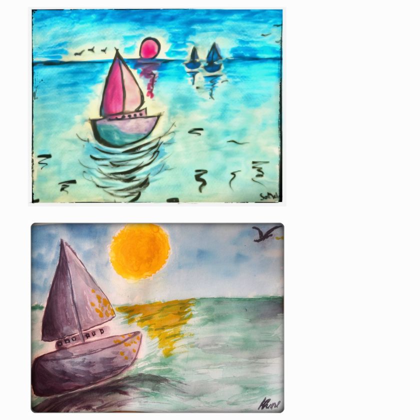 A vibrant watercolor sketch shows a sunset over the sea. A yacht sails under colorful skies. It embodies the joyful essence of summer and artistic exploration.