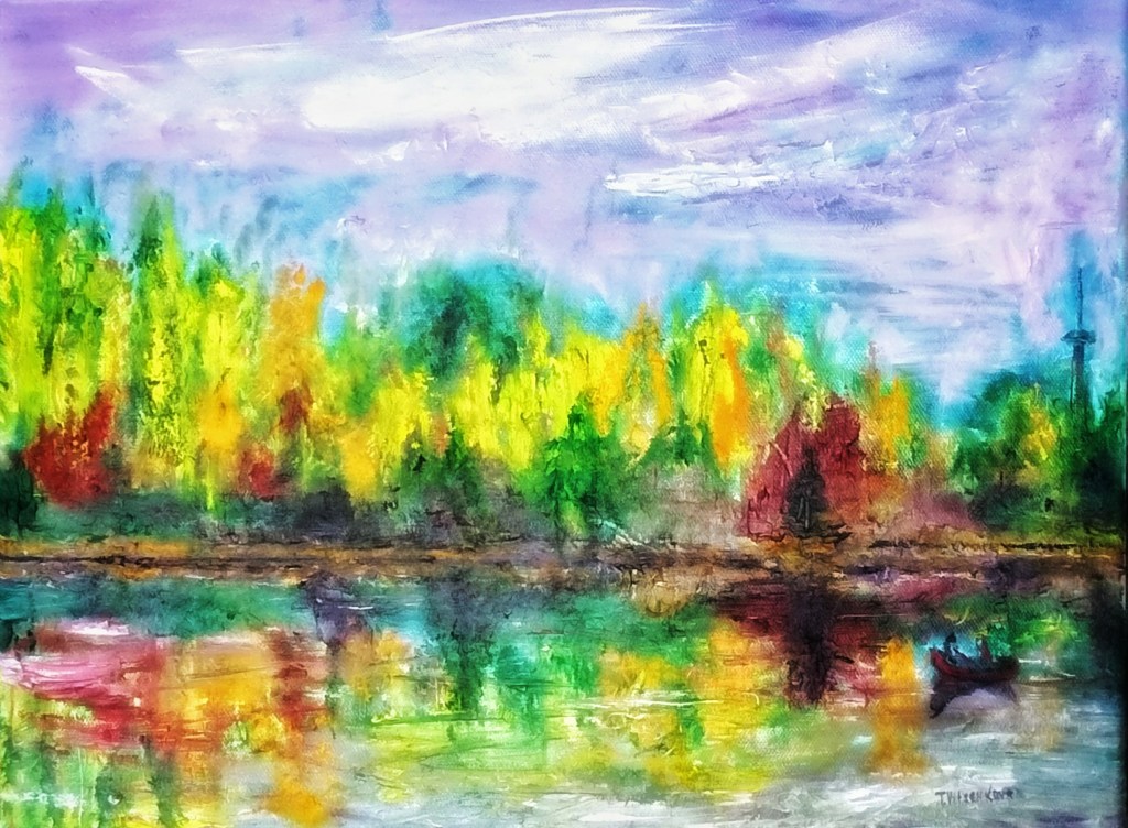 Remembrance Day and Halloween season has its own beauty. The painting was done in fall, with view of bright gold, red and green leaves of forest’s trees with leaves of golden autumn, yellow, green and red colors. The lake and sky’s autumn landscape gave romantic impression in Toronto, Canada. In the middle of the lake it was a boat with romantic couple in a lovely day. Bright original watercolour and ink painting, impressionism style, size 16″ x 12″. 40 cm x 30 cm. Oil artwork.