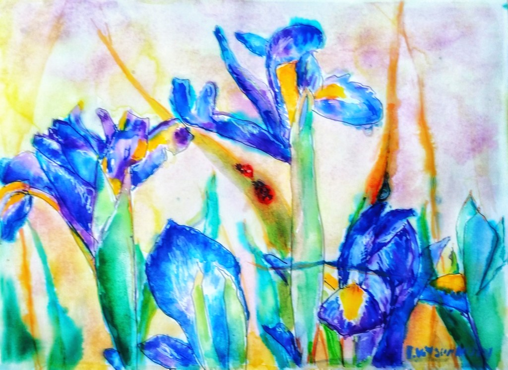 Beautiful summer irises of juicy plum, blueberry and peach colors, long stems of mustard colors with background of corn and turmeric colors, little red ladybugs with dripping raindrops are on leaves of colour of green apples are painted in an impressionism style watercolor floral fantasy for your enjoyment, size 20 x 15cm,7″x5″, $75