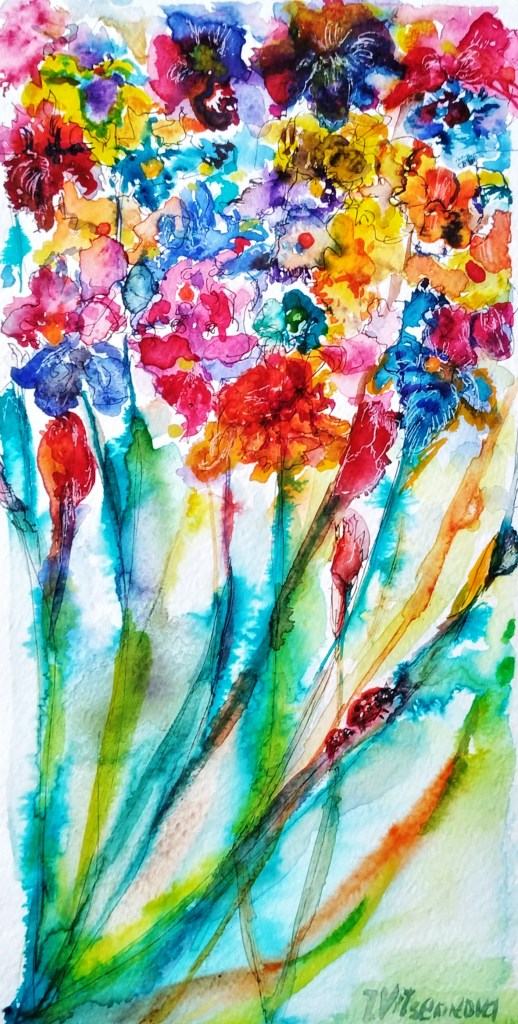 Beautiful summer irises of yellow canary’, cherry and raspberry colours, long stems of orange and celery with citric background of juicy peas and sea depth, little red ladybugs with dripping lilaceous raindrops are on milky leaves are painted in an impressionism style watercolor floral fantasy for your enjoyment, size 17 x30 cm,6″x11″, $100